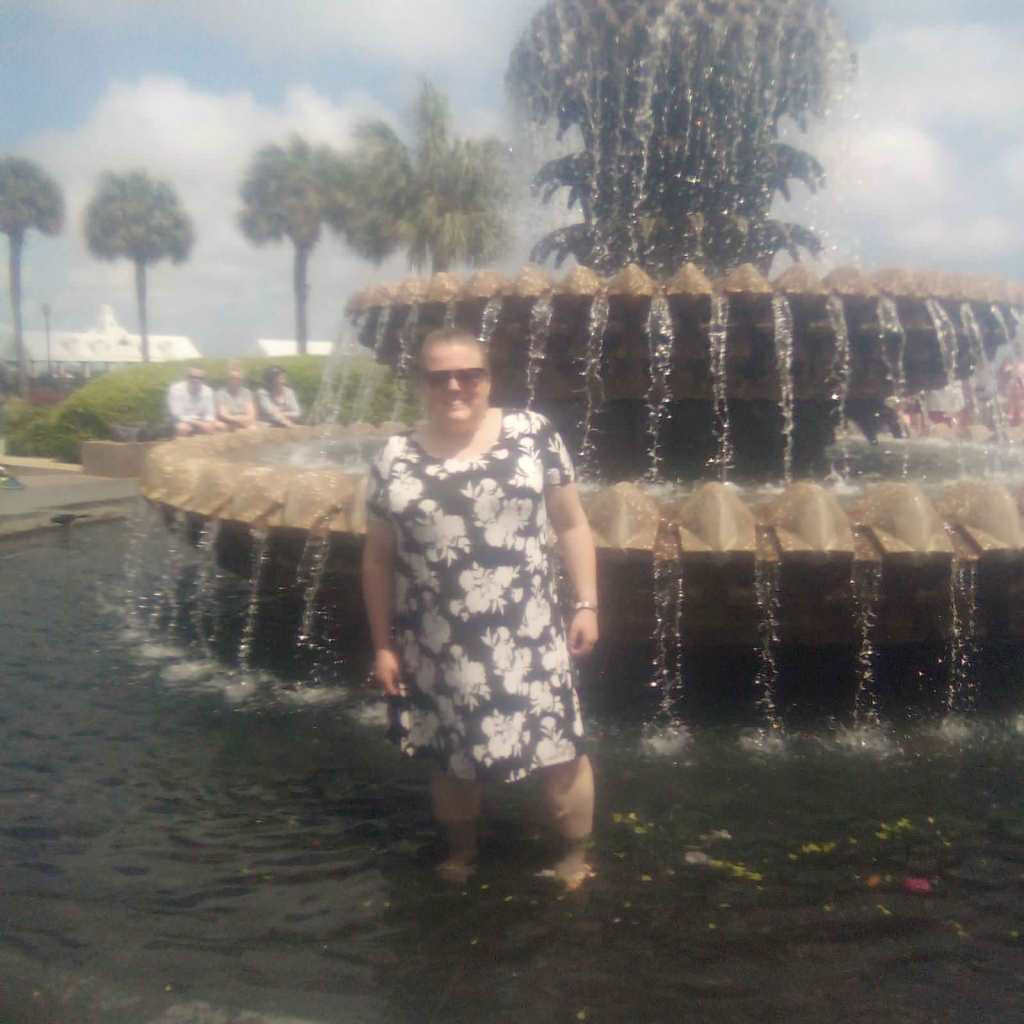 This is me, going into the fountain for refreshing cool off while doing walking adventures. The trees around the fountain are Palmettos, the state tree of South Carolina and other trees adorn the walk ways,