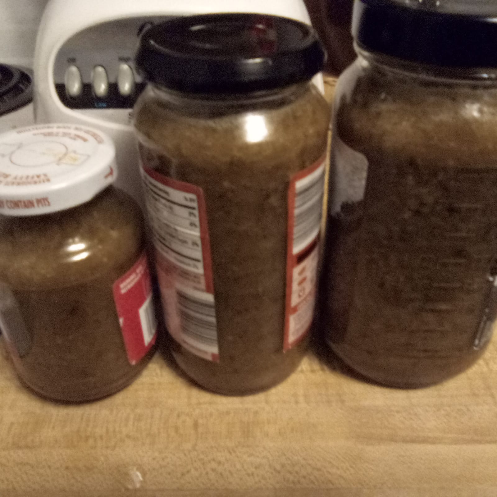 Put contents of the pot in a blender, puree until it’s the consistency of your choice. I put the salsa into upcycled food jars (jars that previously held other things, like marinara sauce or olives, jar and lid thoroughly washed and dried before re-use).