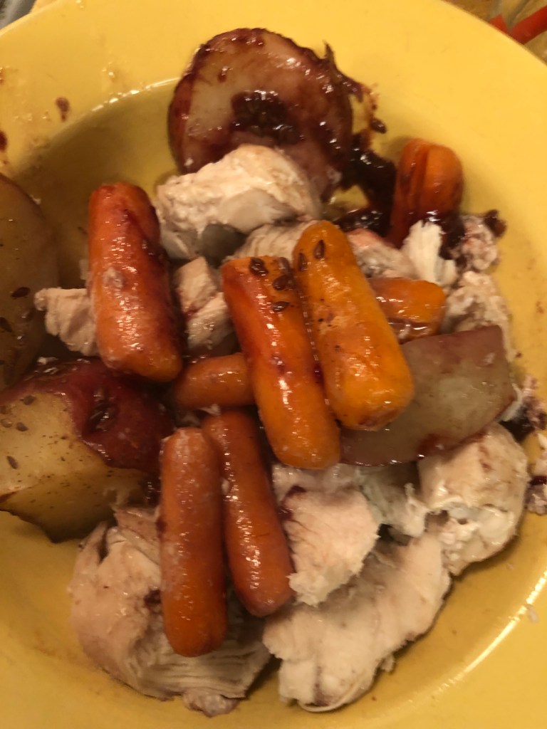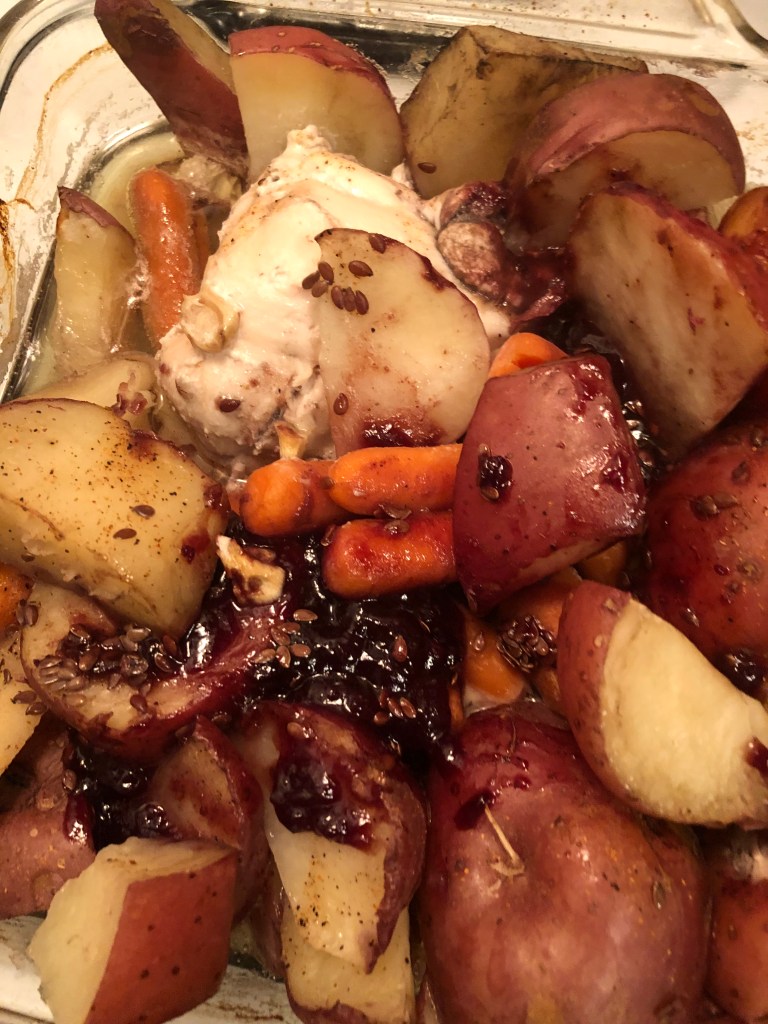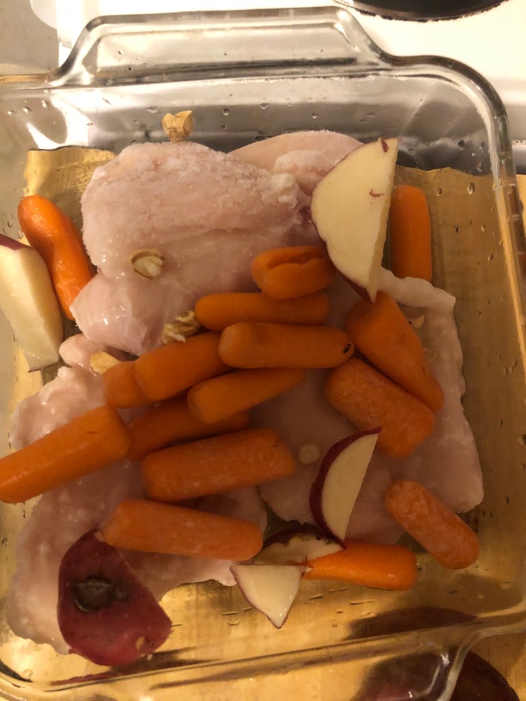 Rub olive oil over the bottom of a glass baking dish, dump everything else in, bake for for an hour or so at 350 degrees or until chicken is cooked and potatoes are done. Serves 6