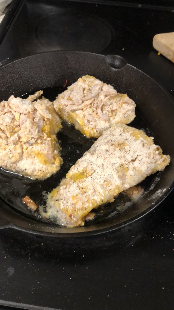 Dip/Run each pieces of fish through the beaten eggs, thoroughly, and heavily coat in the corn flour mix, place in cast iron frying pan (with about an inch of oil of your choice in the bottom).
