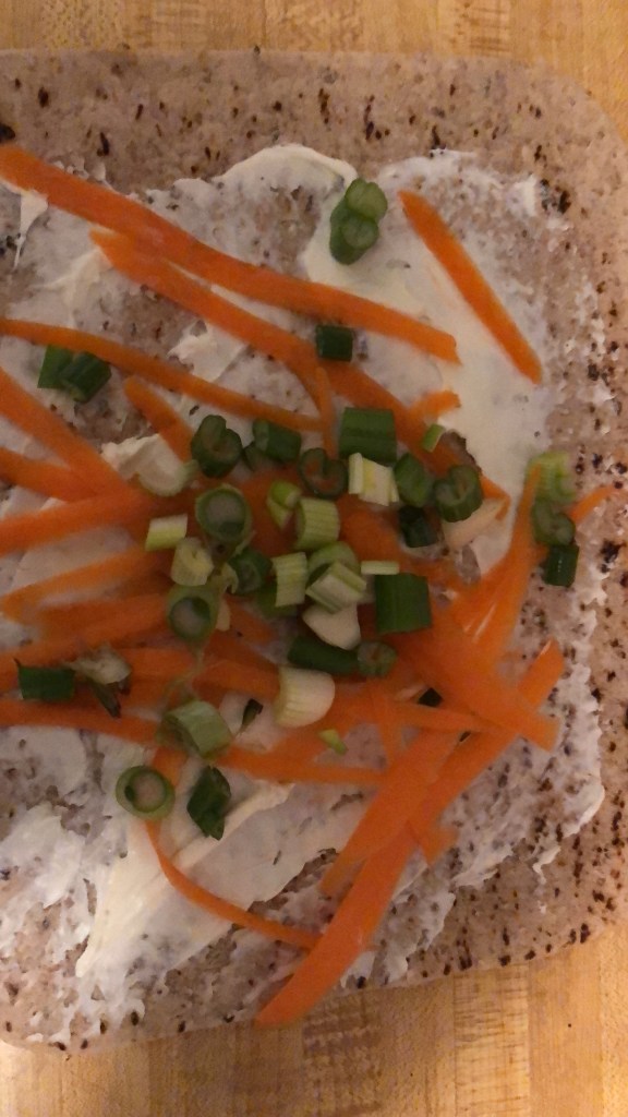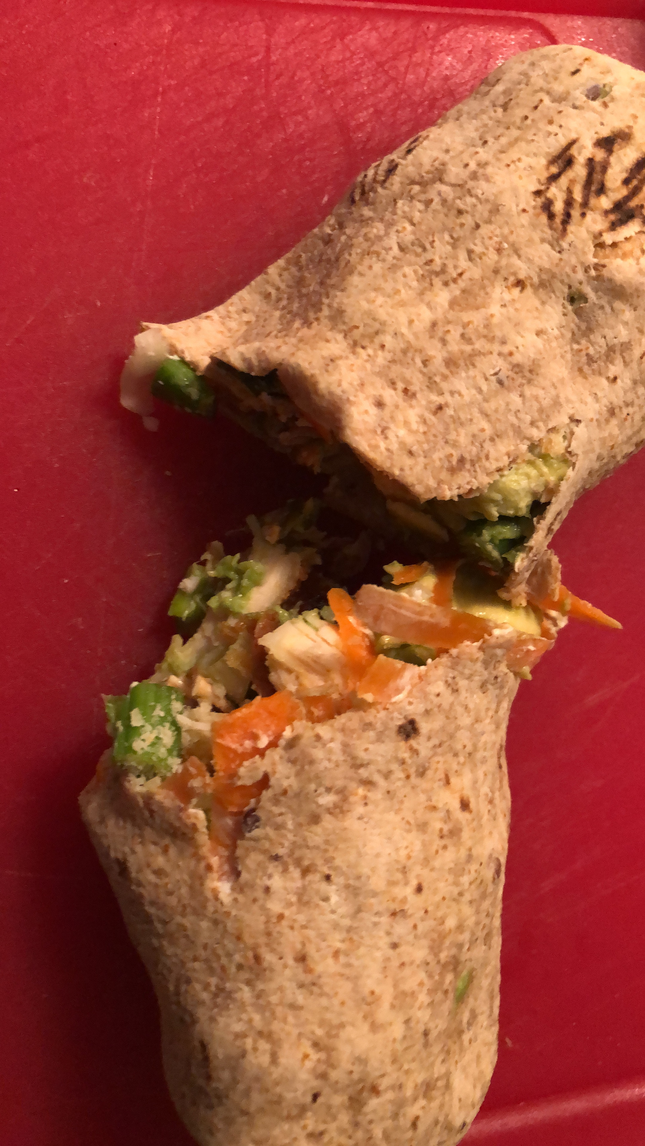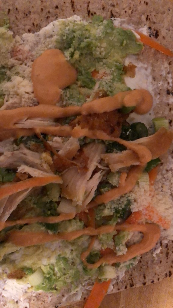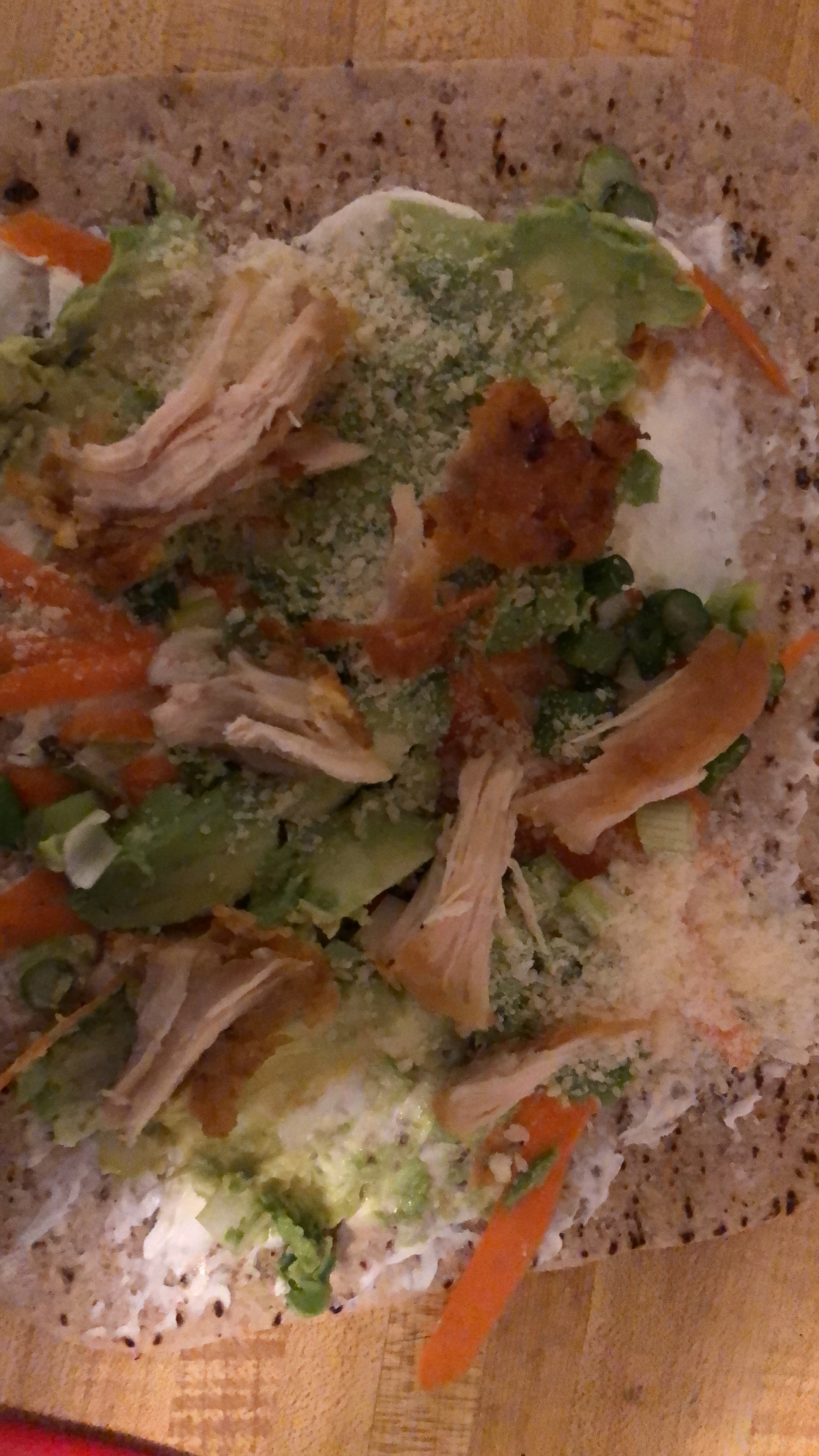 Spread the cream cheese on the flat bread, load veggies and avacado on top,add chicken, sprinkle parmesan and drizzle thousand island dress, roll up like a buritto. I also drank cold drip coffee with it. It was a B- meal.