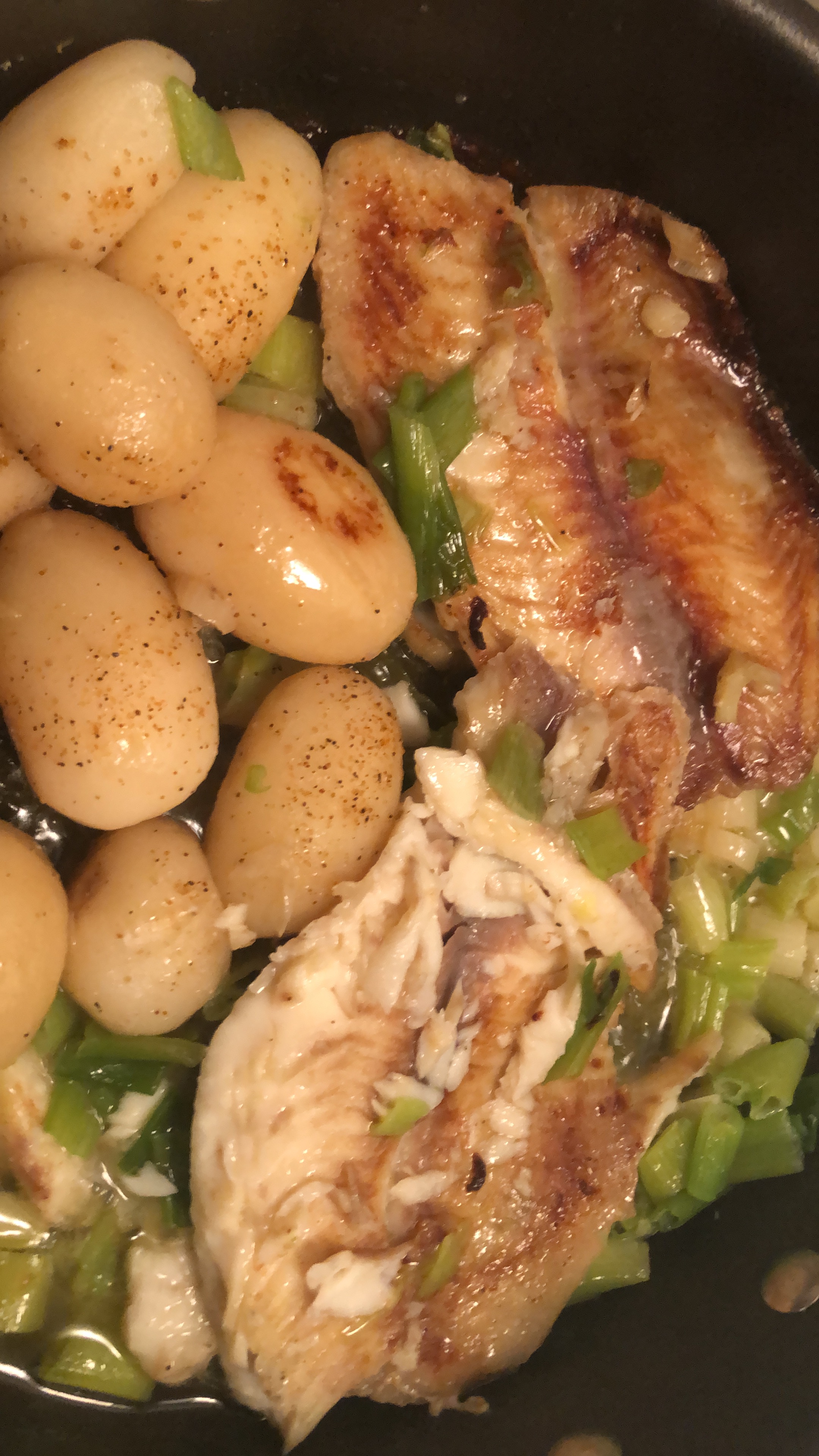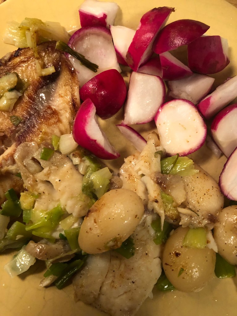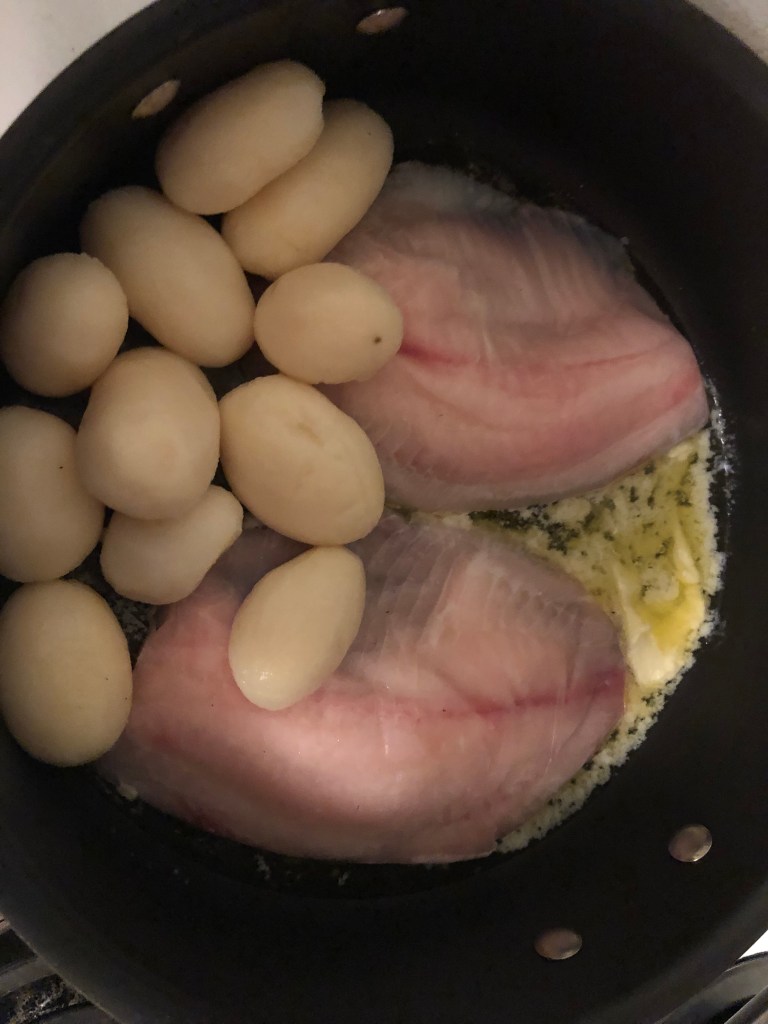 Put butter in a deep pan, add frozen fish, seasonings, can of potatoes, and onions-put on medium heat for about 20 minutes, until fish is thoroughly cooked. Dish out on to 2 plates, with the cut radishes split between the 2 plates.