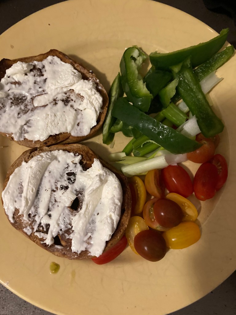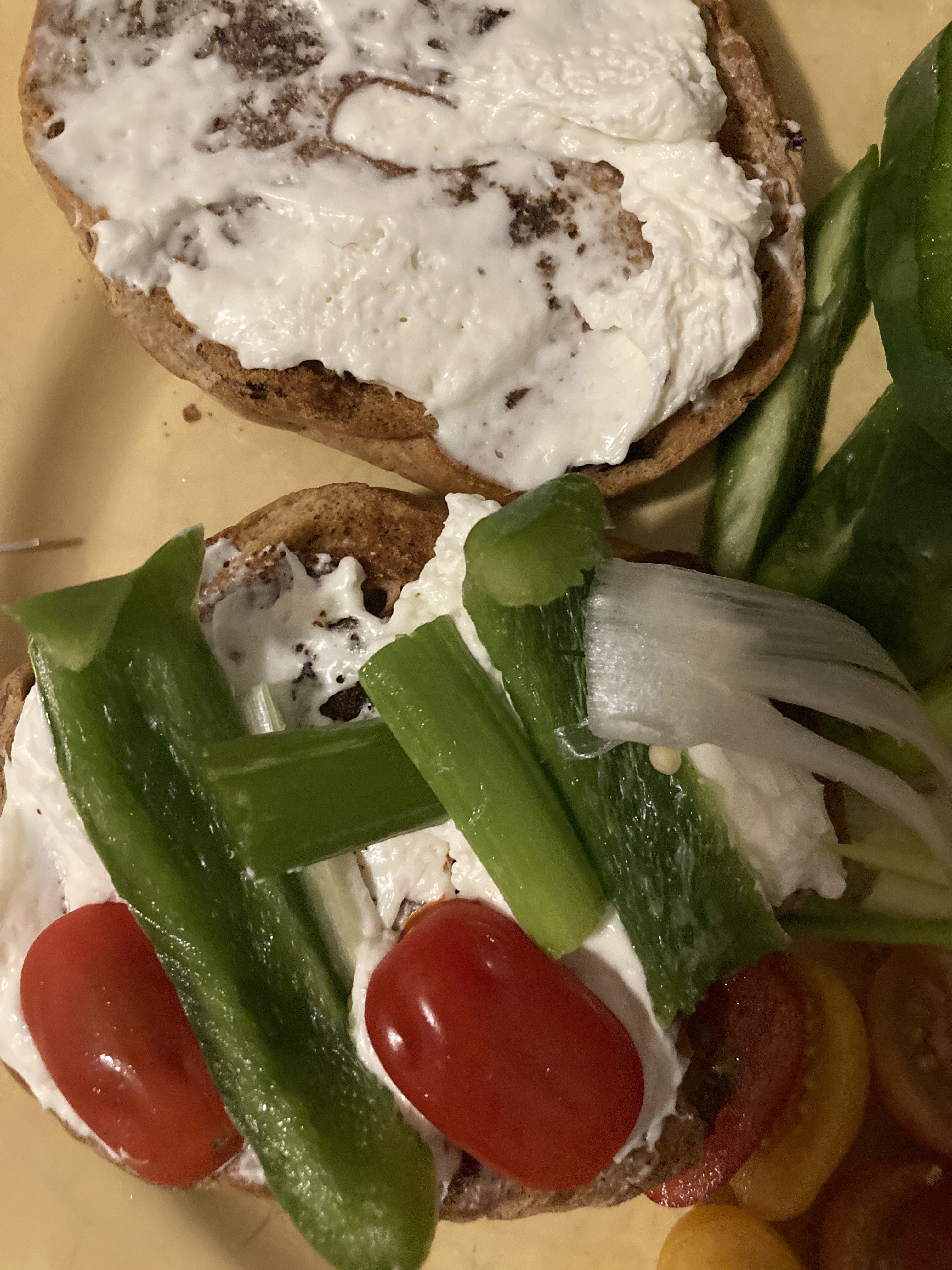 I used whipped cream cheese versus pate/liverwurst on my toasted brotchen and sliced raw veggies and drank a tea with it. Lecker!