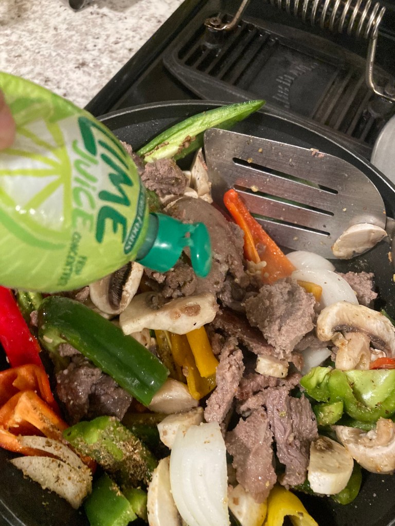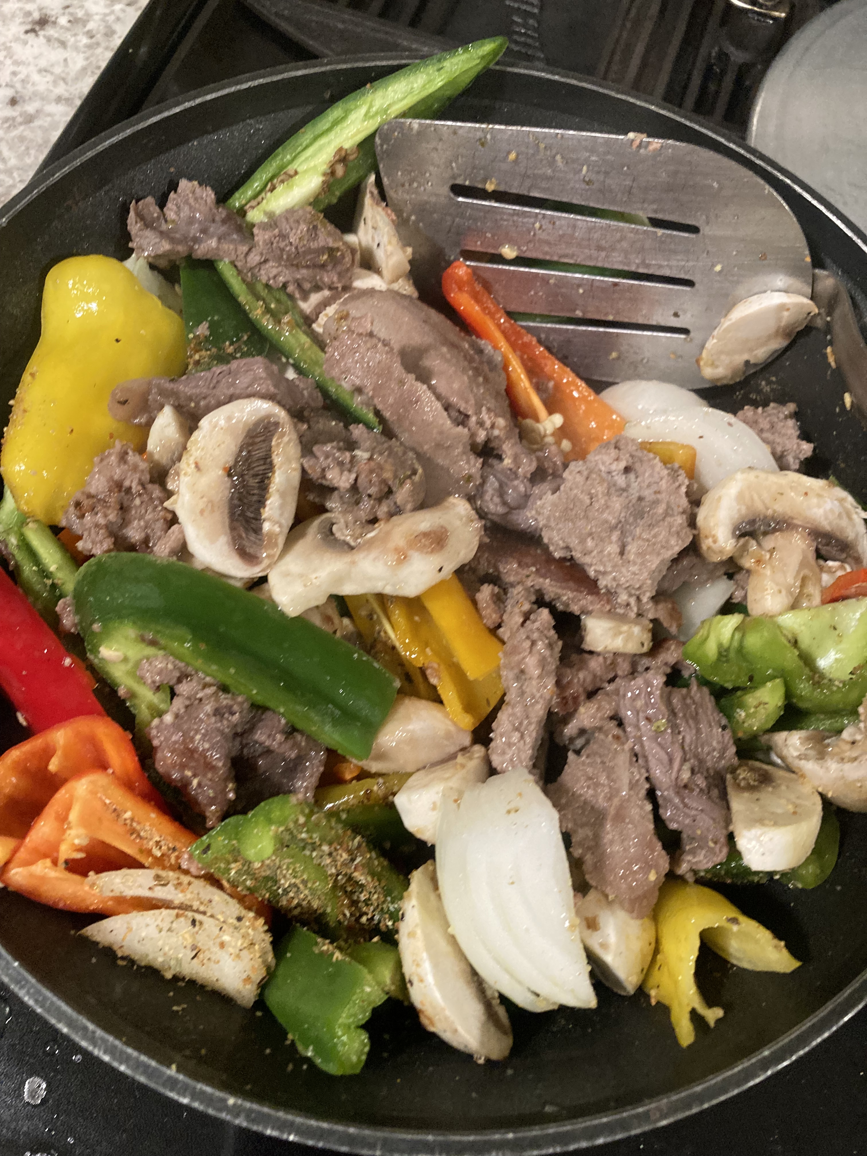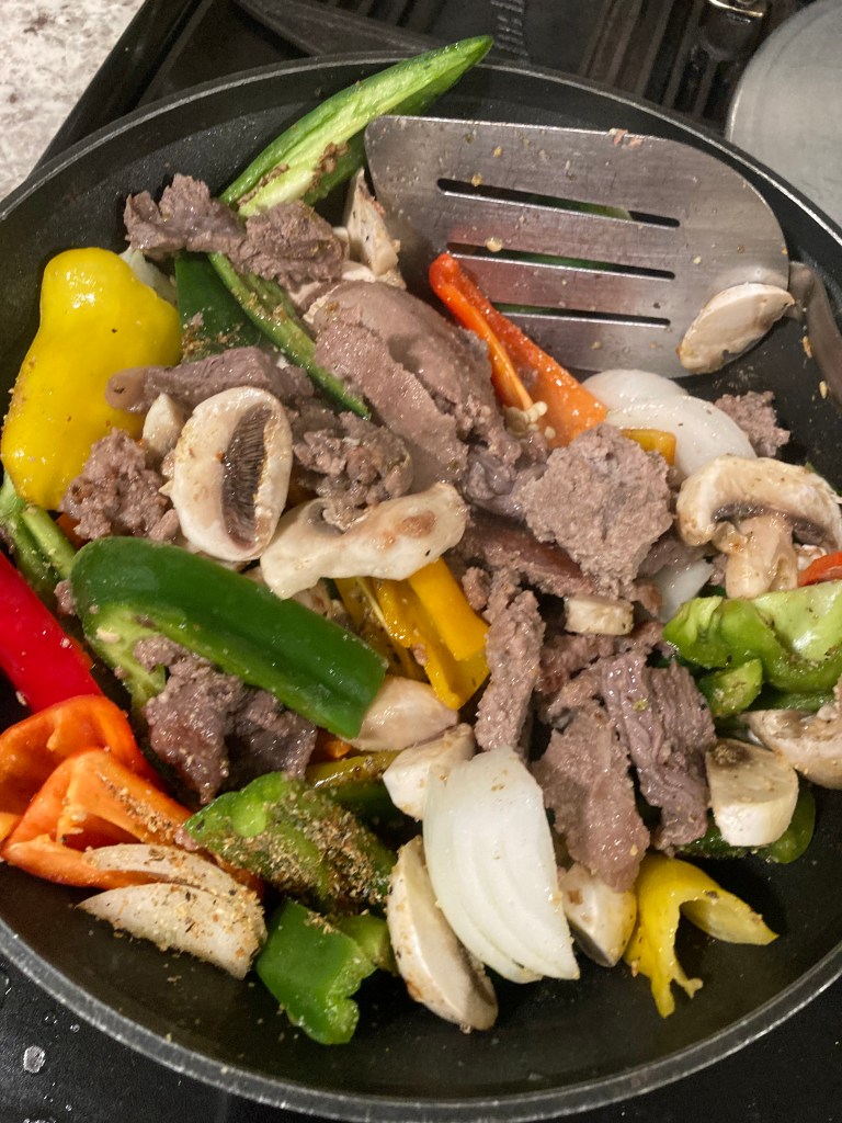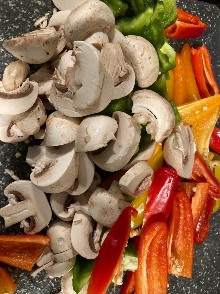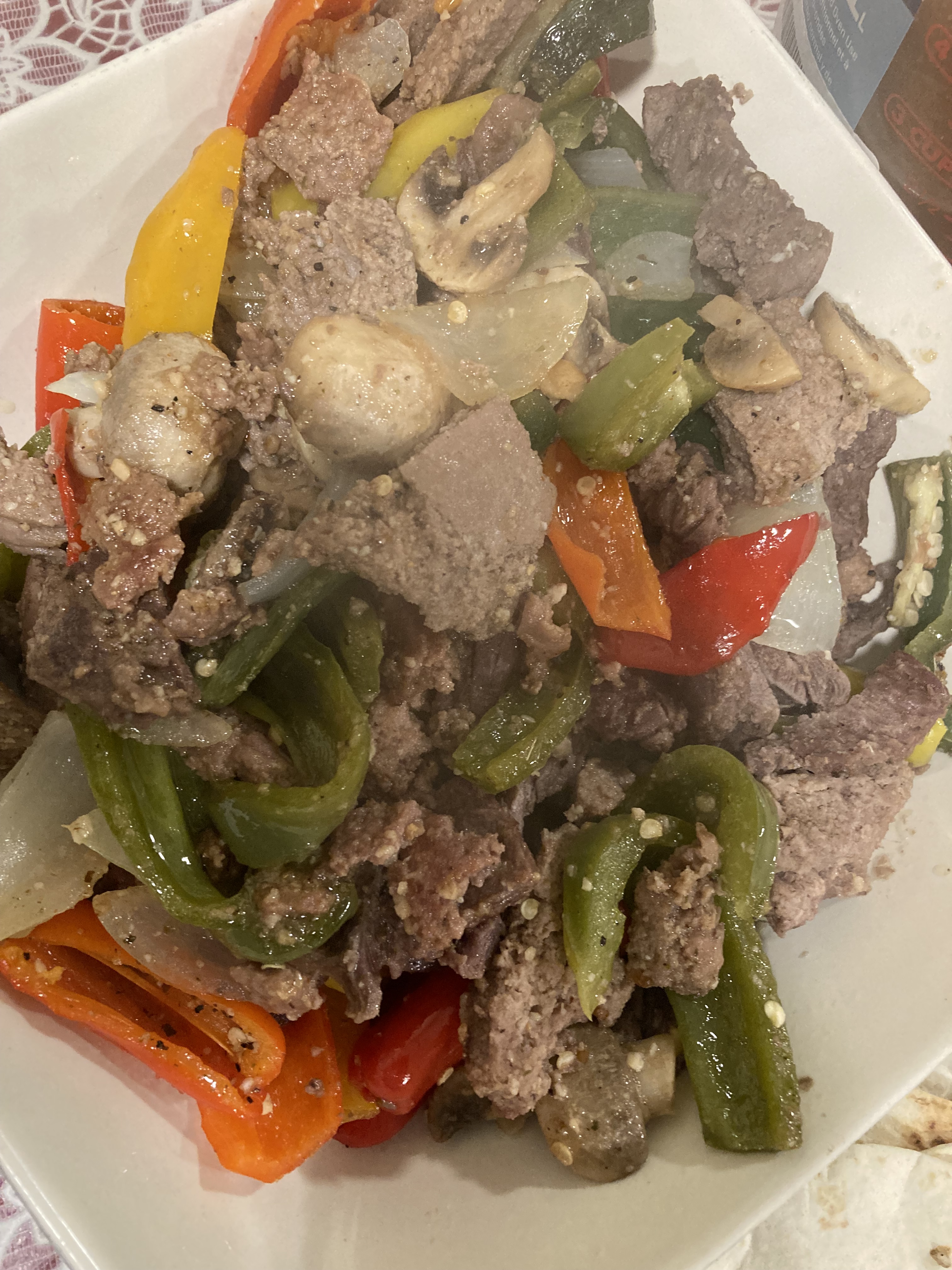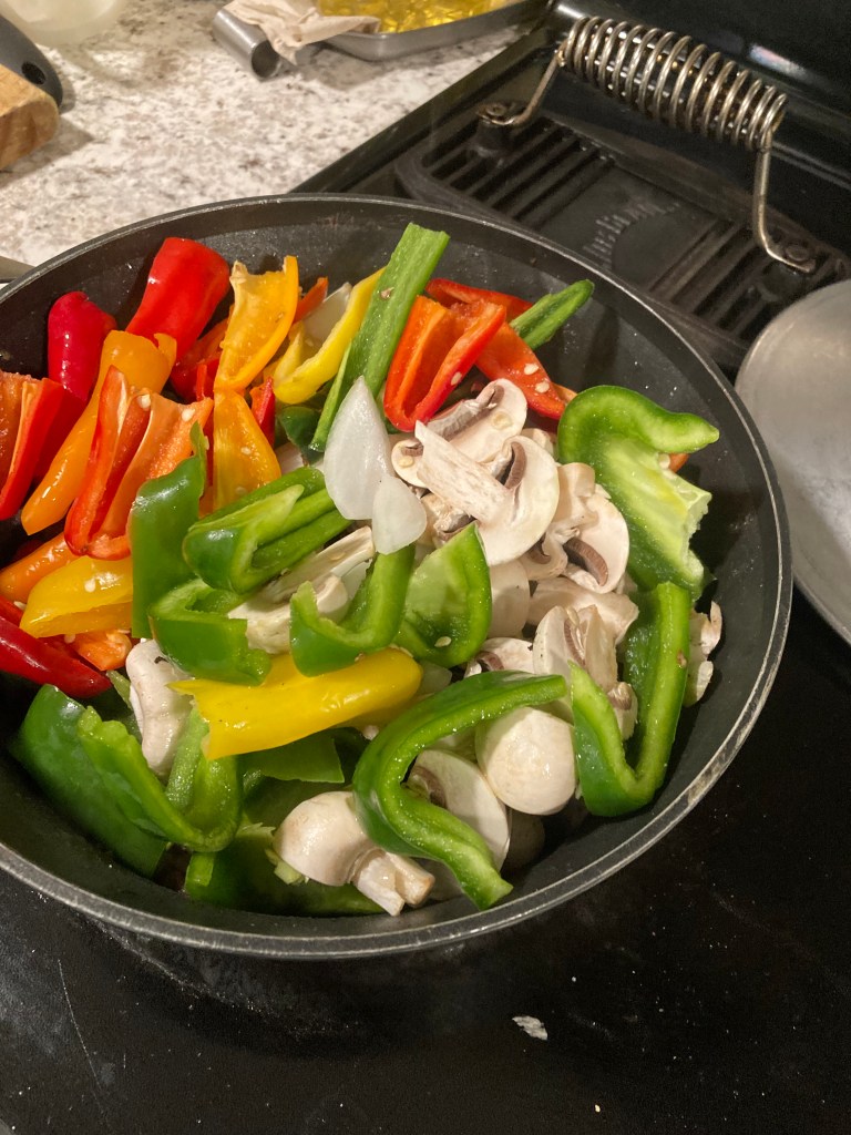 Chop up all the veggies, add to meat skillet when meat is 90% done, adding the Smoked peach rub, 1 tablespoon of garlic and Smoked peach rub. Simmer/Saute on medium low heat until the veggies are soft but crips and meat is fully cooked.