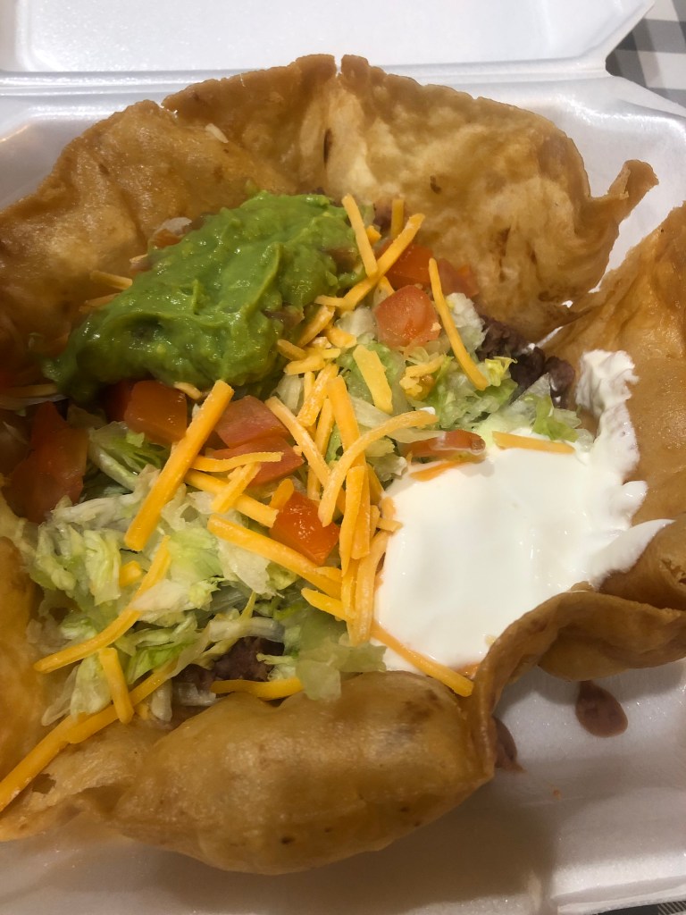 I ordered the taco salad and wowser! So good and definitely ample portions–no skimping and one definitely could share it, unless they are little piggies like me!
