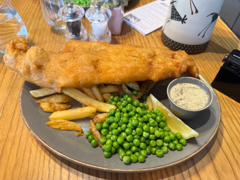 Kevin and I, while in Cromarty, on the Black Isle, had our very first Fish and Chips in Scotland-garden peas, salad, and a homemade cream sauce/tartar included–absolutely worth it! While I had eaten at this restaurant many years before, I knew how delightful the cuisine is at Sutor Creek-but for Kevin, it was a first, and he couldn’t get enough!