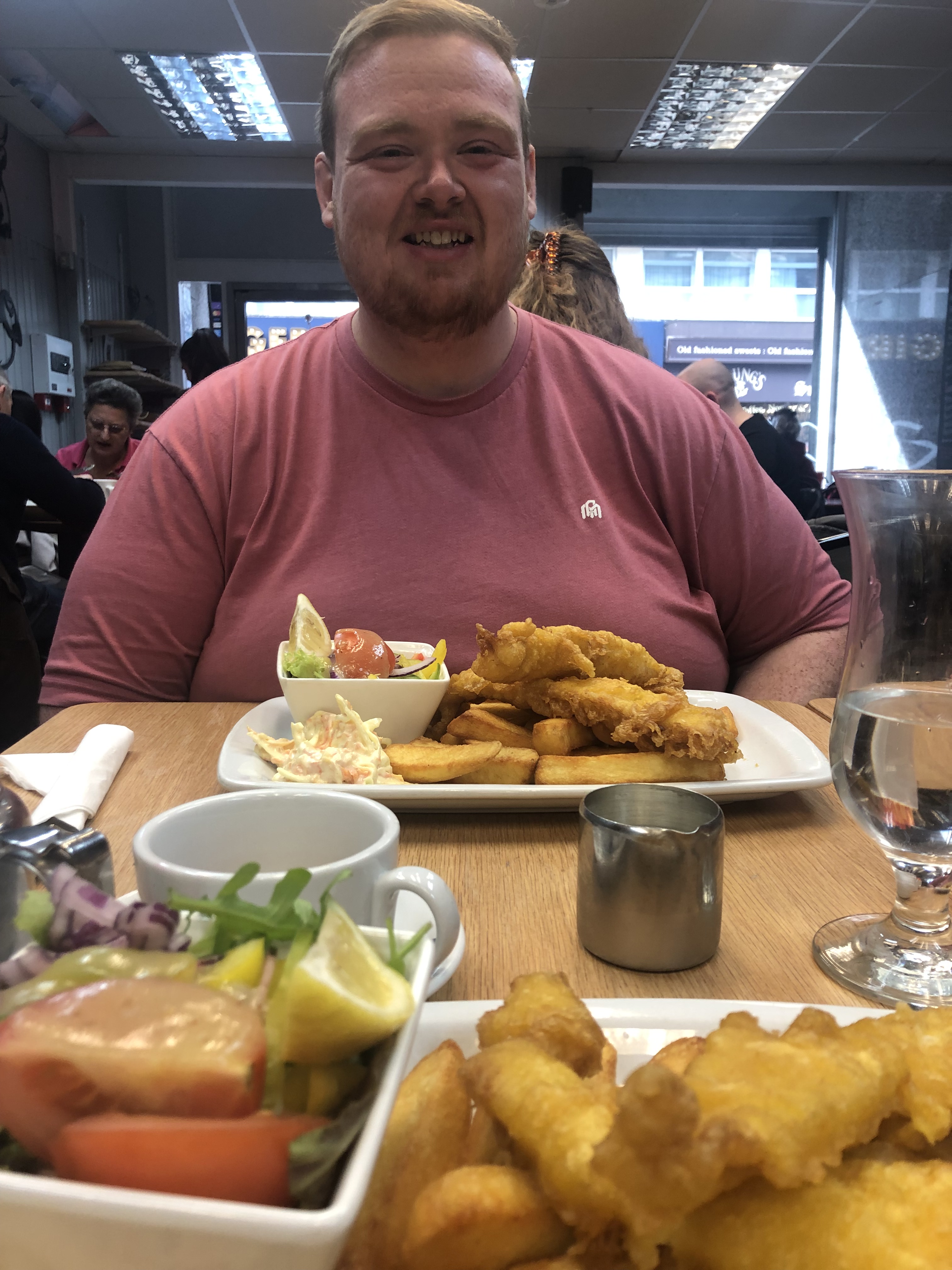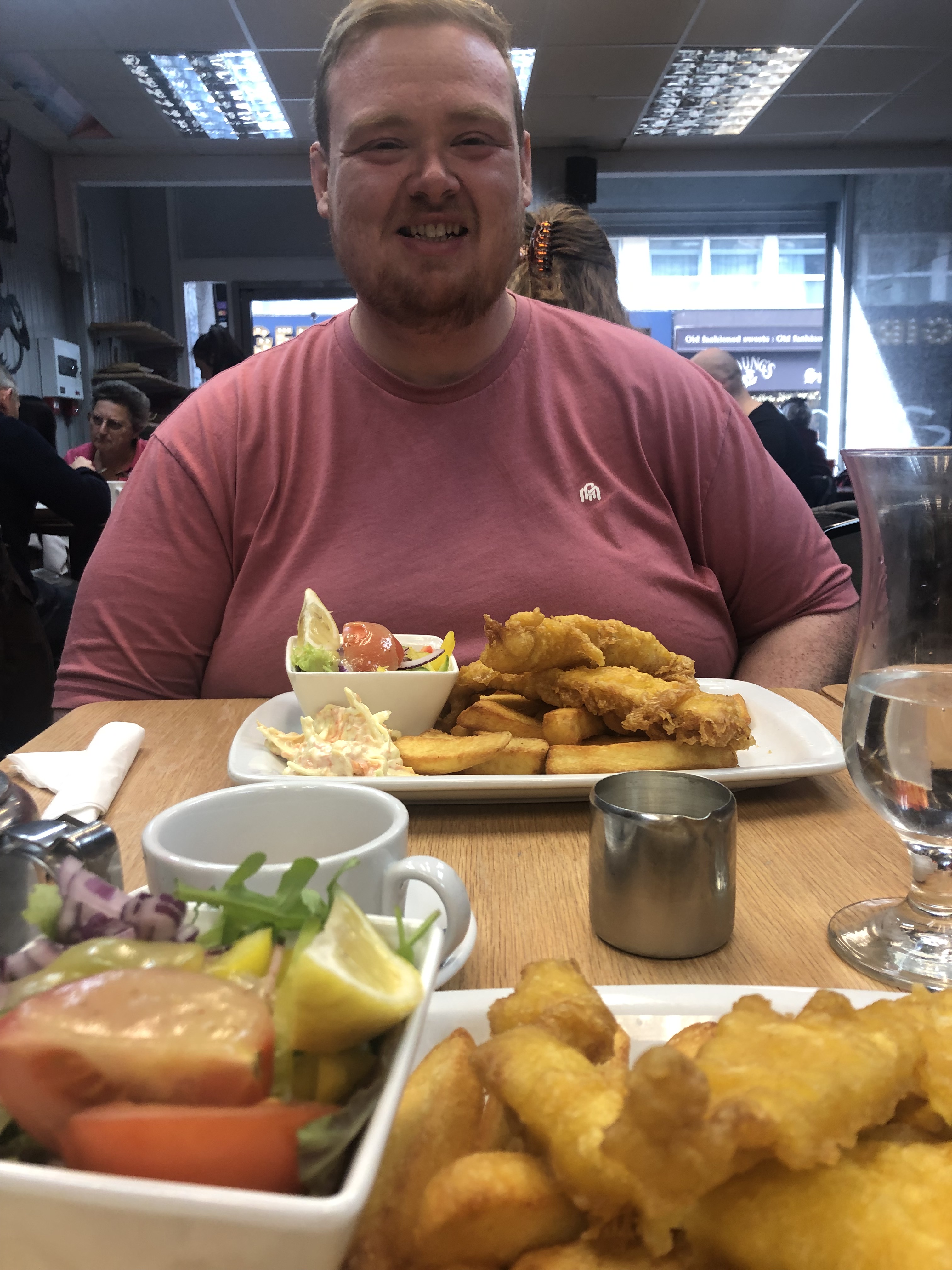 After leaving the pub, I stopped by Max’s, an essential if you are going to Inverness–it’s a takeaway place that offers amazing food and they are open late. Tonight was the second time I ate there on this trip–first go around I had the Doner Plate and tonight, freshly done fish and chips with extra malted vinegar and salt.