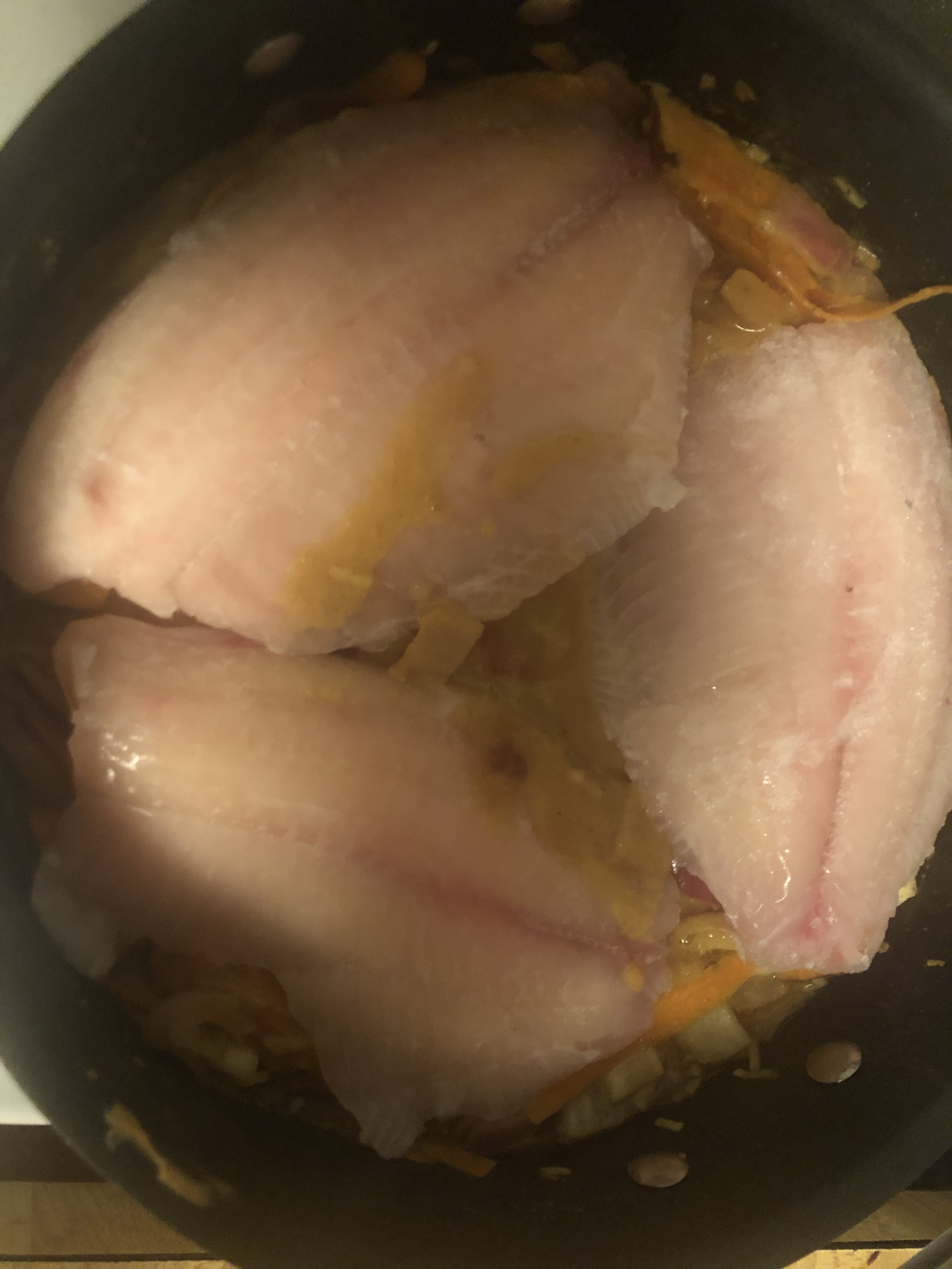 Simmer and stir for 10 minutues, put the fish on top, cover and let simmer for 40-45 on medium heat until fish is done and veggies are soft/cooked through. Mix well to break up fish and incorporate everything together.