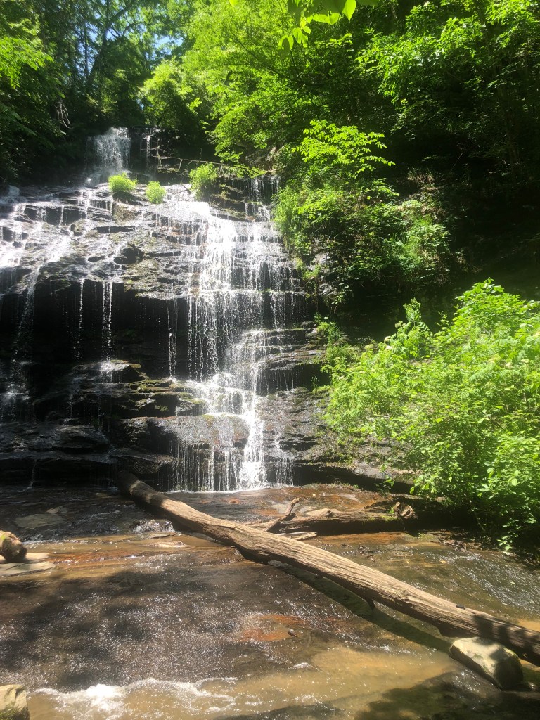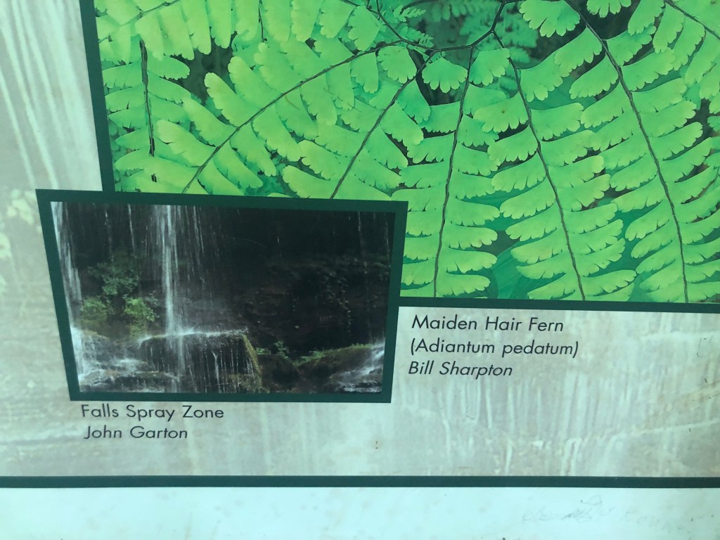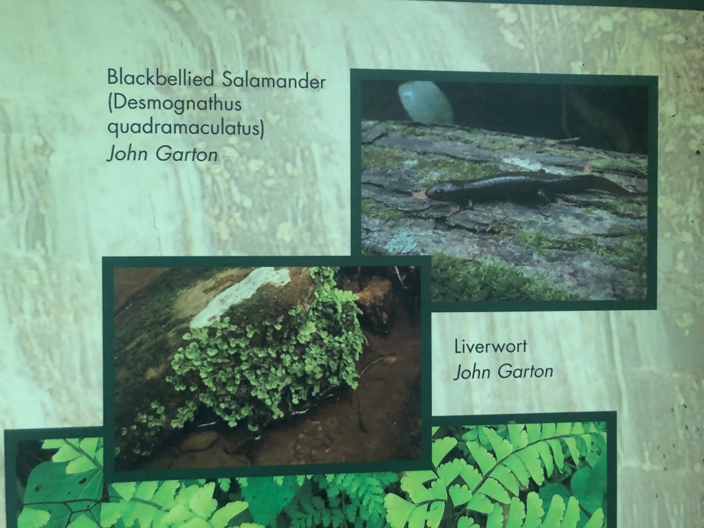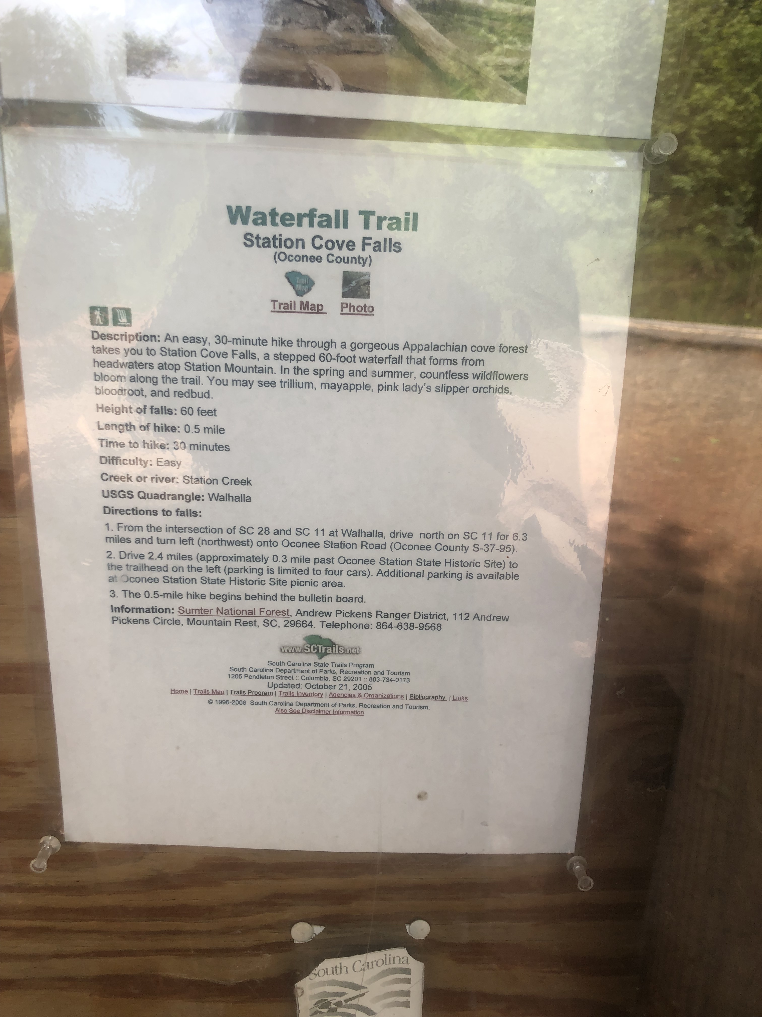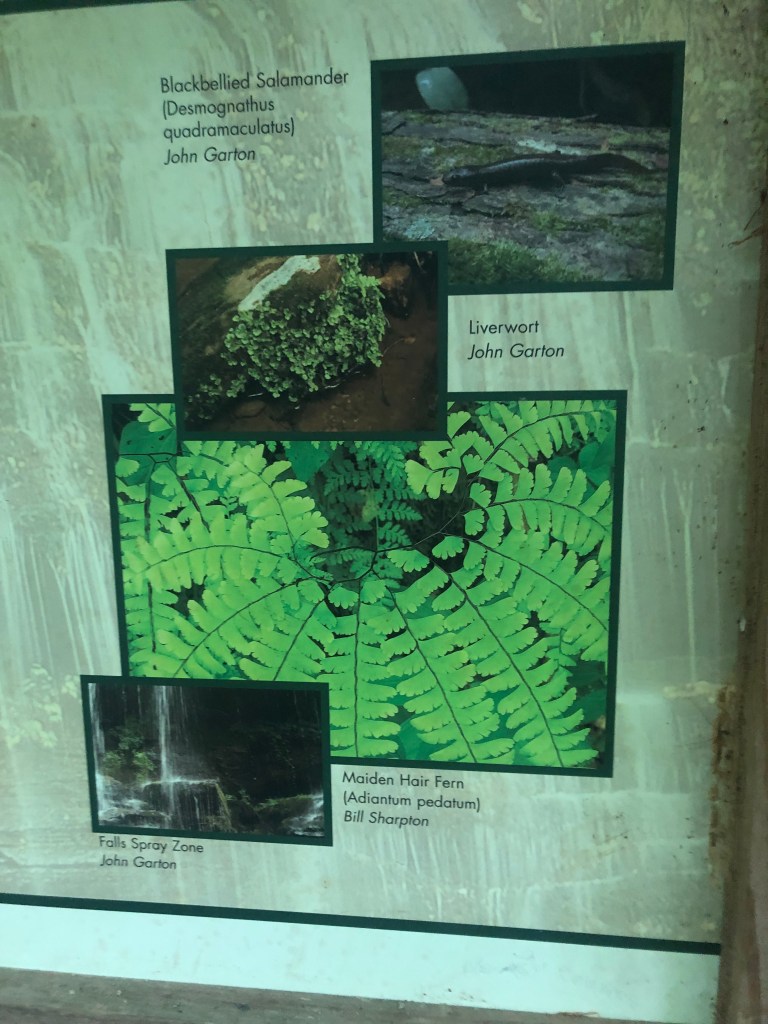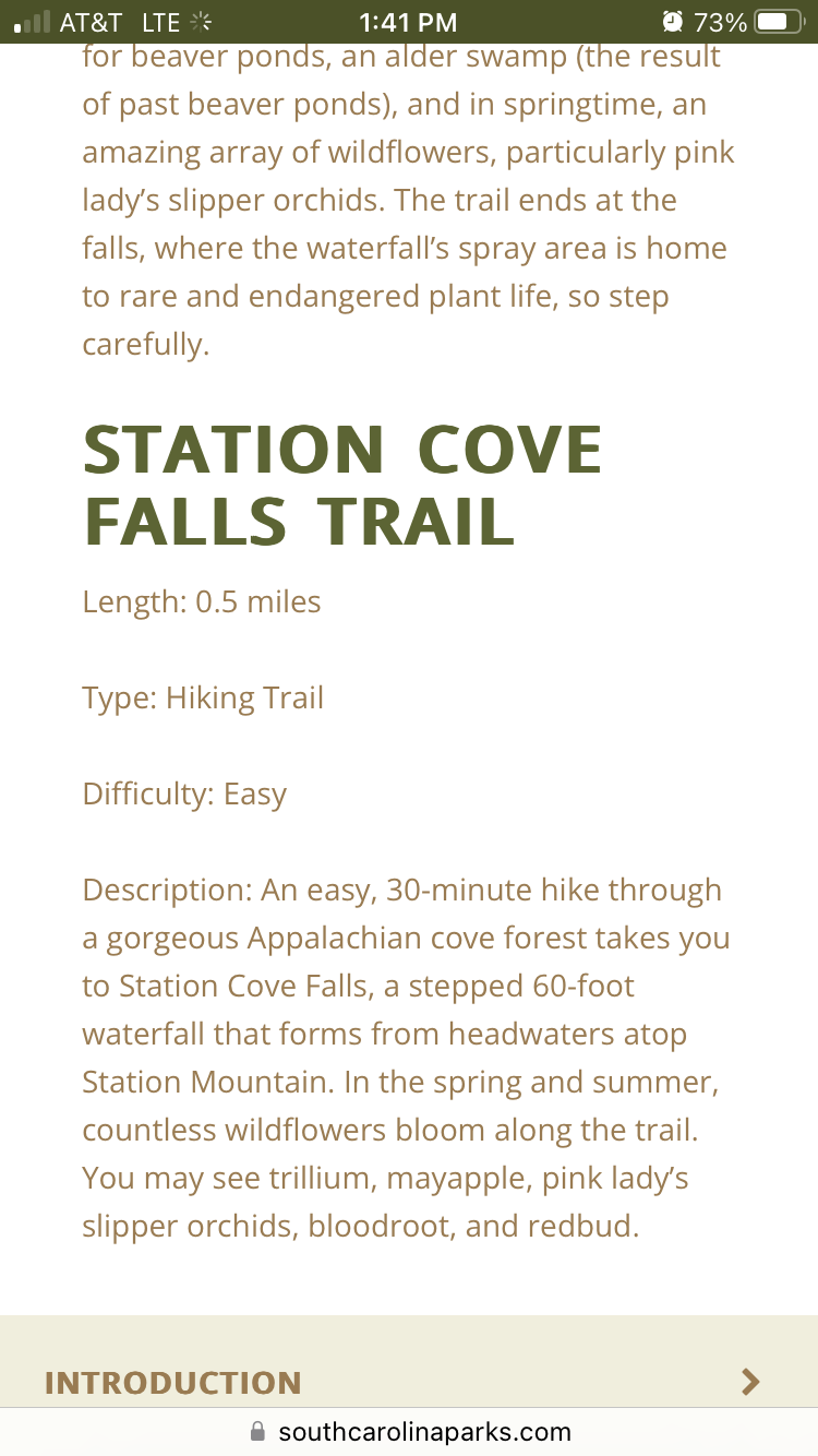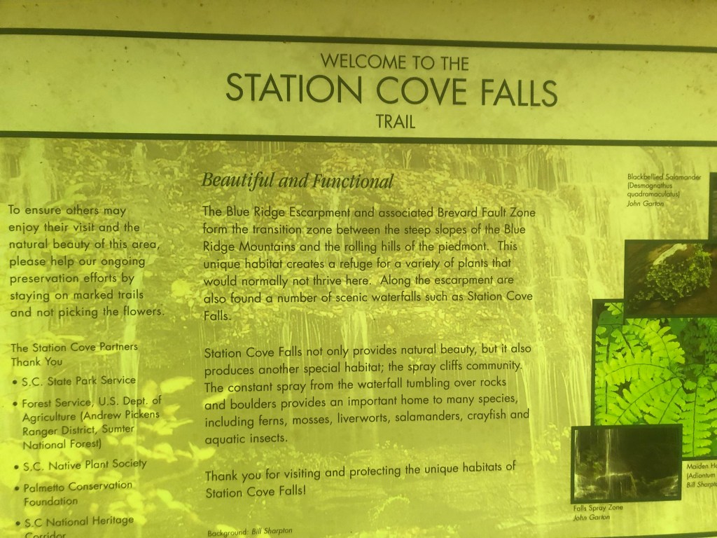 There is a trail head, just off the shoulder of HWY 11 (near Walhalla, S.C.) that I parked at, feet from the trailhead that lead to the Station Cove Falls–as seen in the photos, there are a several different informational placards, which is super helpful, not holding for “treasuring hunting” the local flora and fauna (seeking only, no harvesting or picking!)