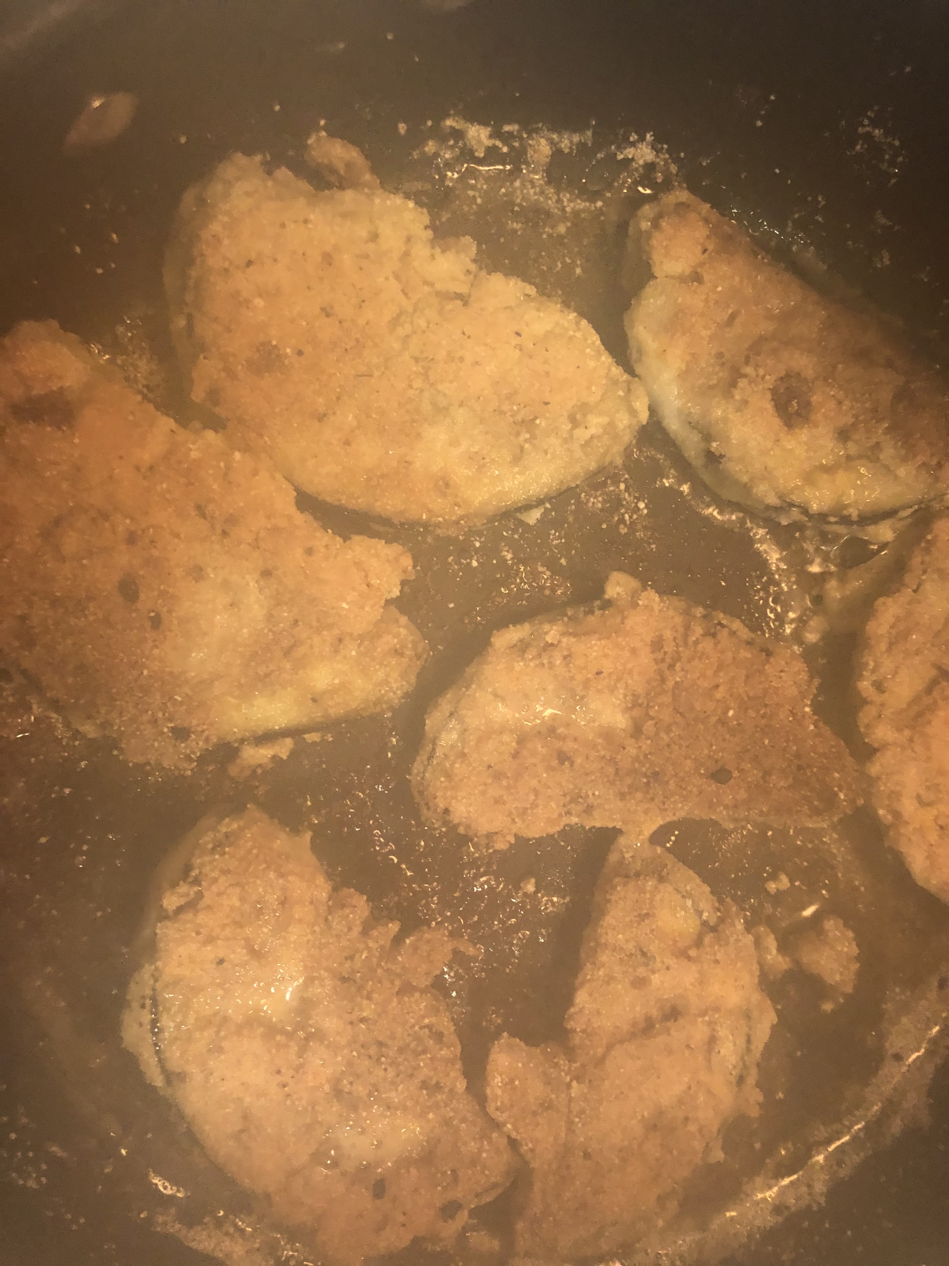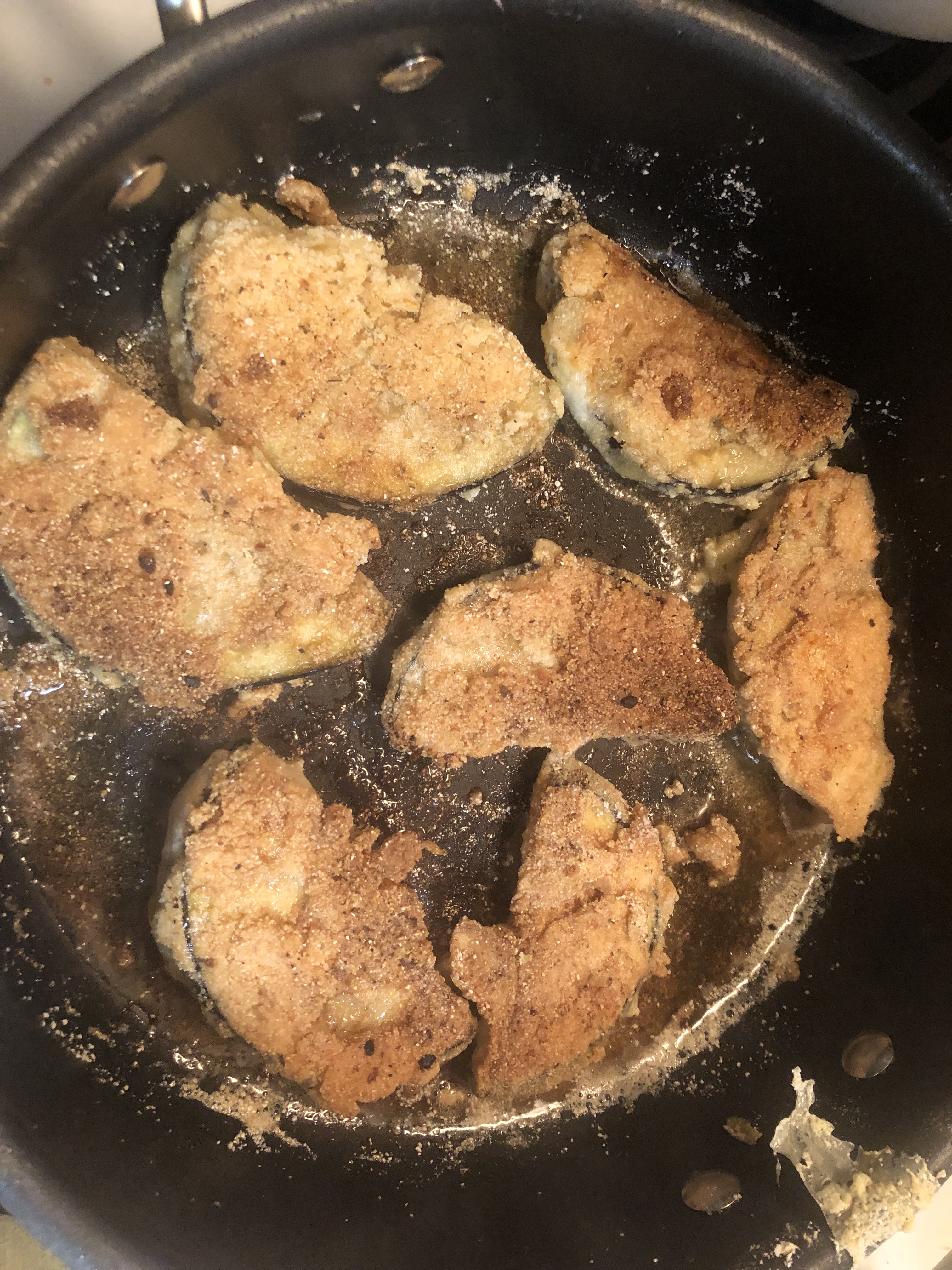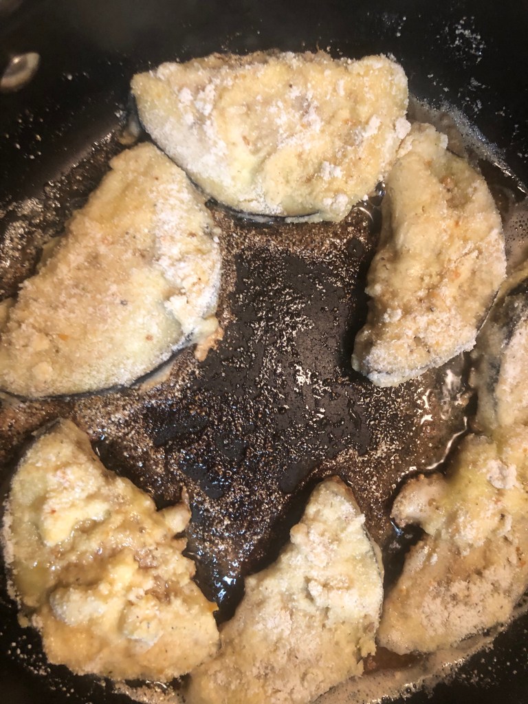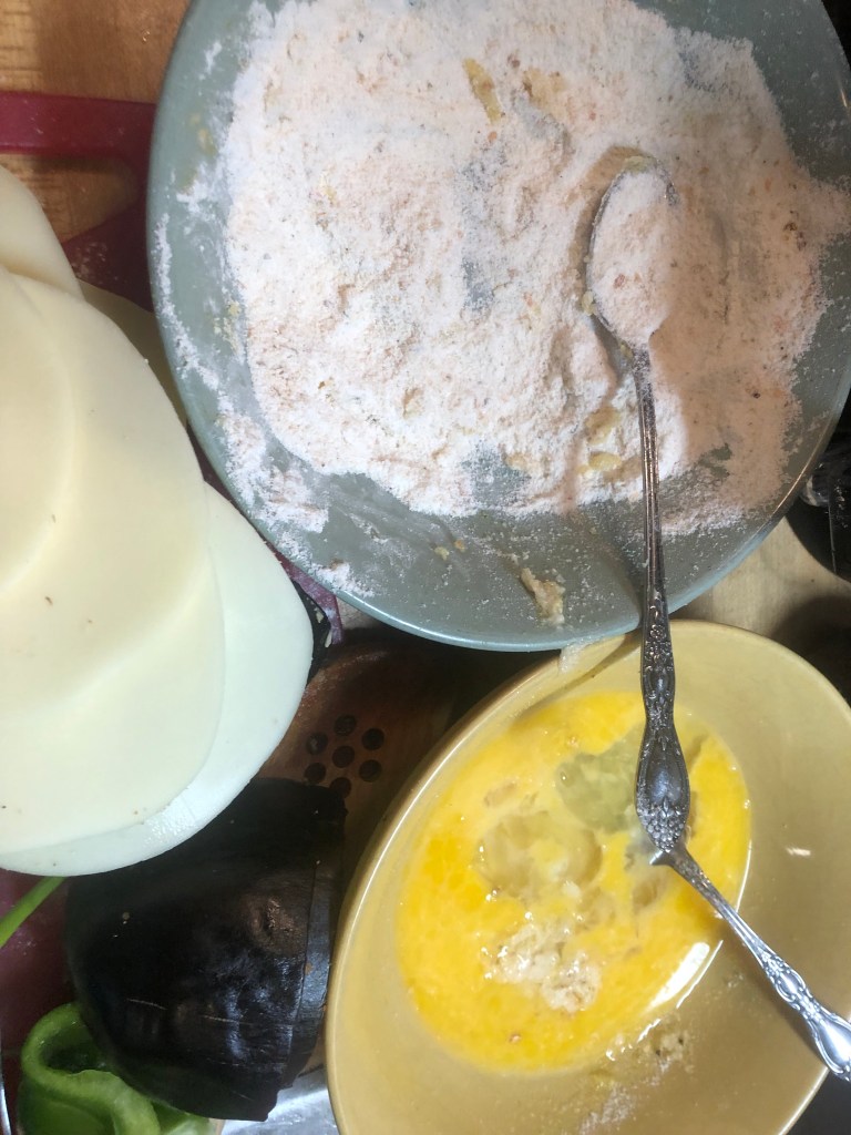 Dip each piece of eggplant into egg wash and cornmeal flour twice and lightly fry on both sides until lightly brown in olive or coconut oil