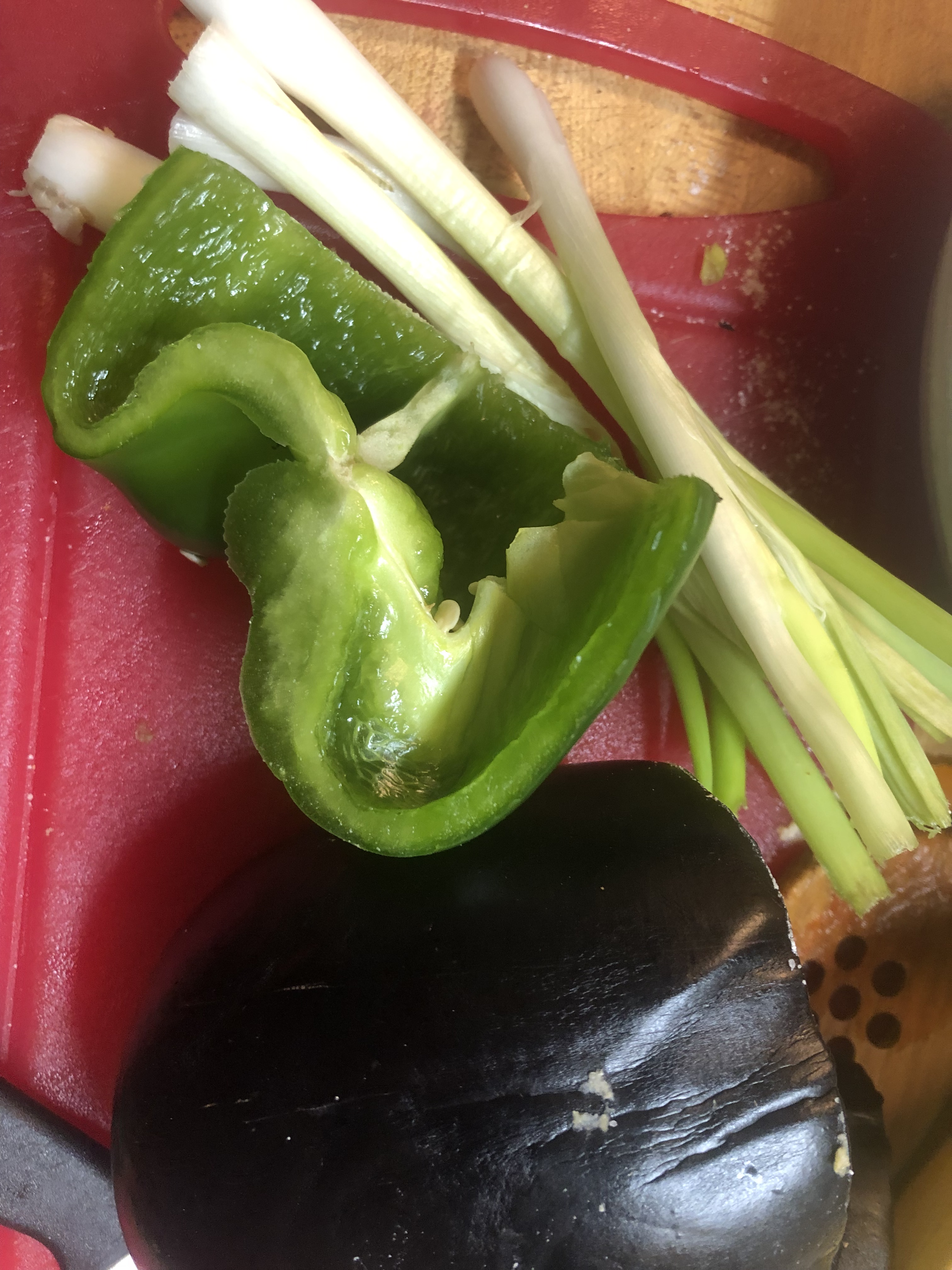 1 bunch of scallions, large bell pepper, large eggplant