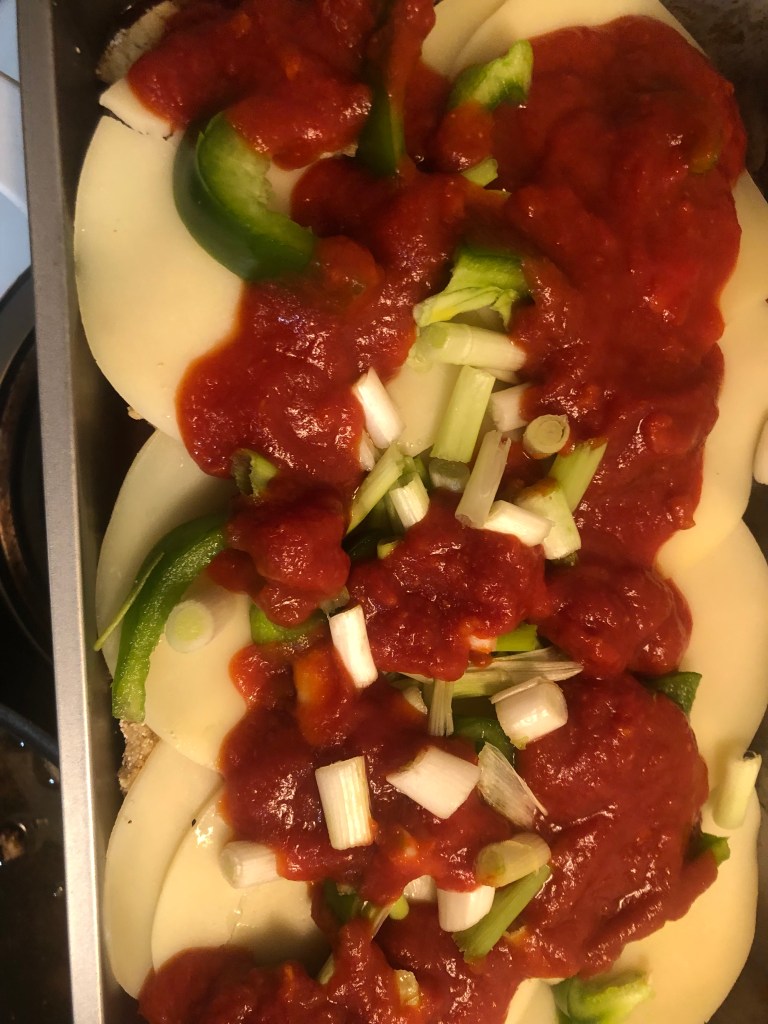 I like to lightly sprinkle McCormick Grill Mates “roasted garlic and Herb” seasoning between each later for a little extra pizzaz. Happy Cooking!