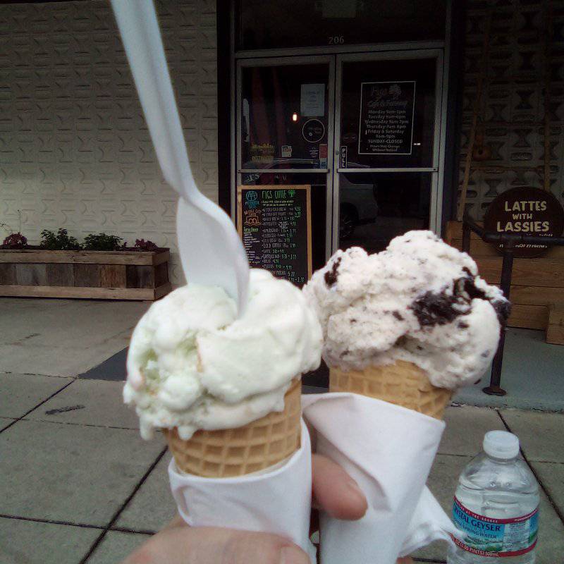 I enjoyed trying something new–a Mayan Mocha…bursting with steaming flavors of mildly spicy chilis and robust brewed beans, it was a huge treat for me–mixing spices and flavors together that I had previously never had blended together. My brother enjoyed a regular latte and enjoyed the frothiness and flavor as well as he is Classic Cookie and Cream Ice Cream cone.