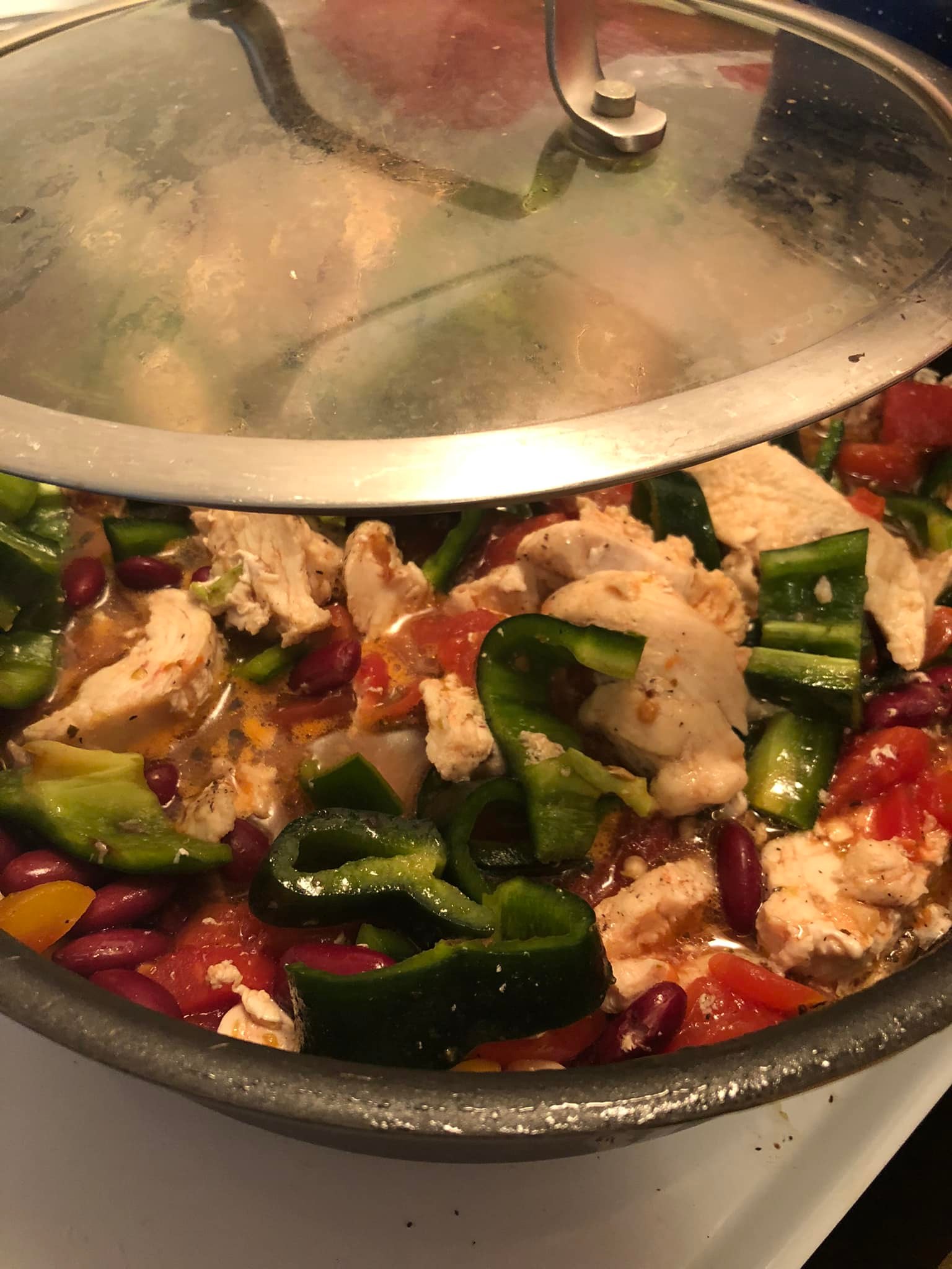 Open cans of beans and tomatoes, don’t drain, add everything to the chicken pan