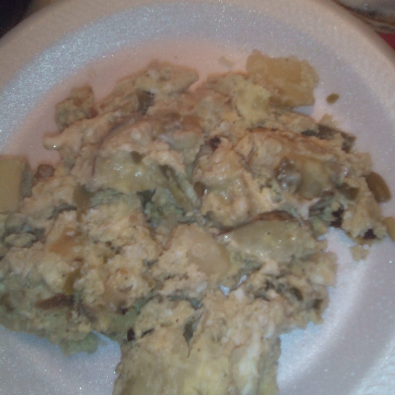 Put the meat on the bottom of the baking dish, layer the veggies on top, sprinking the seasoning in between stuff, pour water into the dish.