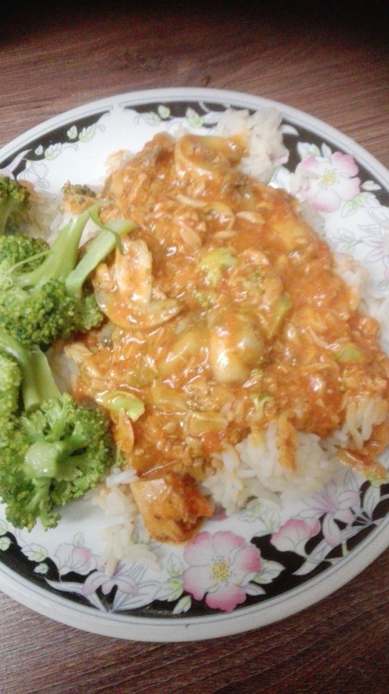 Serve curry mix over rice and broccoli as a side. Serves 2 to 4